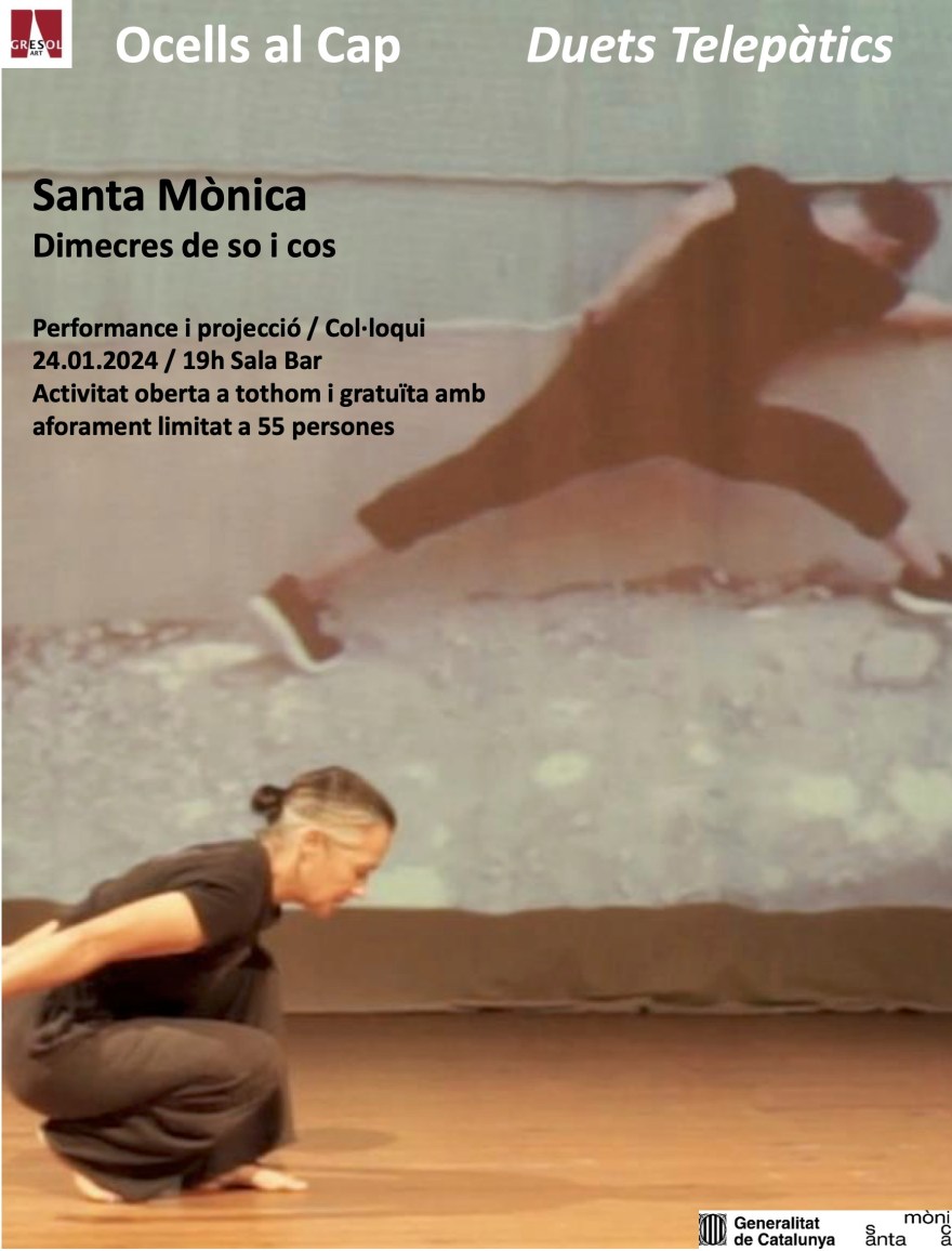 Ocells al Cap were invited by the arts centre Santa Monica in Barcelona to curate three evenings of performance in the season of events Dimecres de So I Cos (Sound and Body on Wednesdays). On the first evening (the 24th January 2024), there were two groups of artists. One group were physically present in the arts centre Santa Monica, and the other group were connected to the arts centre by video from different countries. The name of one artist from each group was selected by chance and they both performed simultaneously. For these duets, the artist connected by video was projected onto a wall and the partner artist performed live in front of the projection in such a way that it was possible to watch them both working at the same time in different spaces. In this work Telepathic Duets, the artists have no previous knowledge of what the others will do. There is a random selection of pairs and these make their performance without watching each other work. The whole performance duet becomes visible to the artist only when they watch the documentation of it.During the event, we observed the work for synchronicities and connecting threads of meaning. Several volunteers from the audience were invited to write down what they saw. There was a fruitful and inspiring discussion afterwards between the artists and the audience.