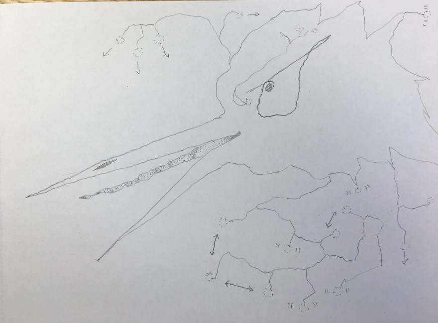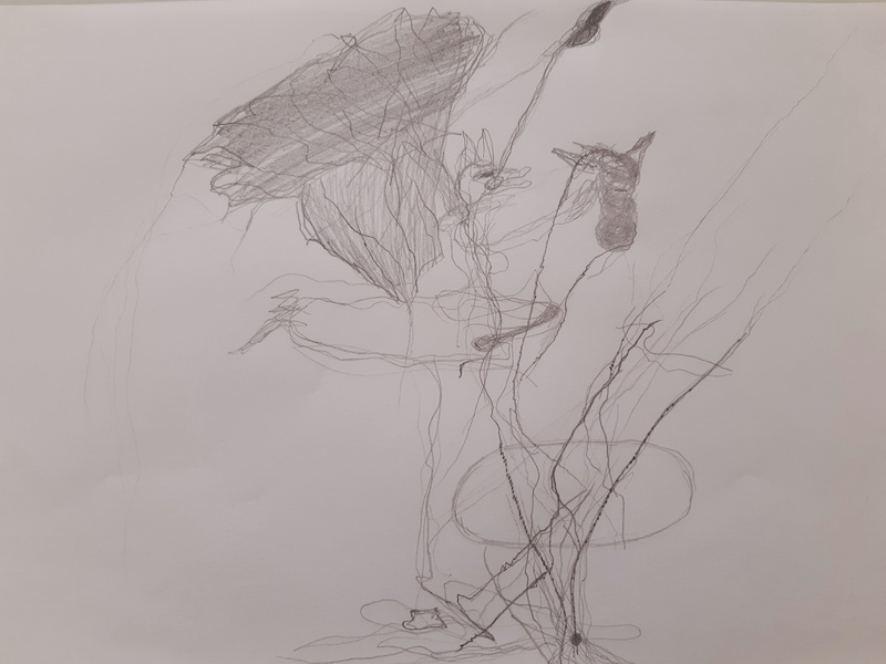 Ocells al Cap have developed a telepathic drawing-at-a-distance practice in which artists draw for 15 to 30 minutes each one on her own home, and then we compare the drawings for synchronicities.